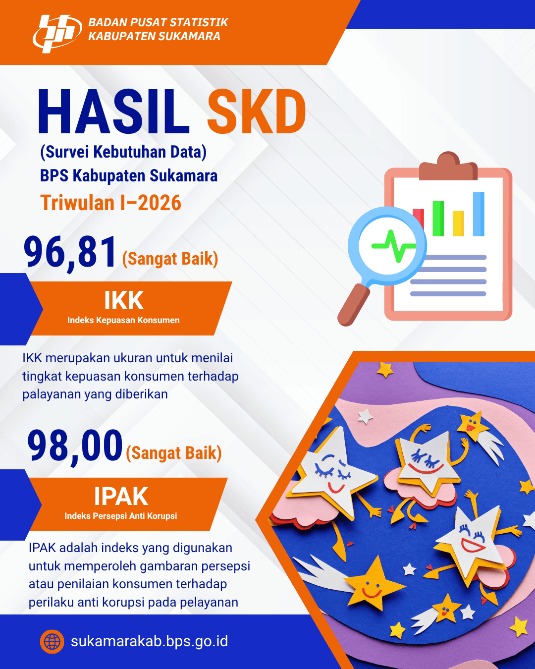 Pelayanan Statistik Terpadu (PST) BPS Kabupaten Sukamara terus meningkatkan layanan kepada masyarakat pengguna data.Salah satu kegiatan untuk mengukur kepuasan konsumen data, PST BPS Kabupaten Sukamara melakukan Survei Kebutuhan Data/Survei Kepuasan Masyarakat.Hasil SKD Triwulan 1 2026 menunjukkan bahwa nilai IKK dan IPAK PST BPS Kabupaten Sukamara masuk dalam kategori Sangat Baik.