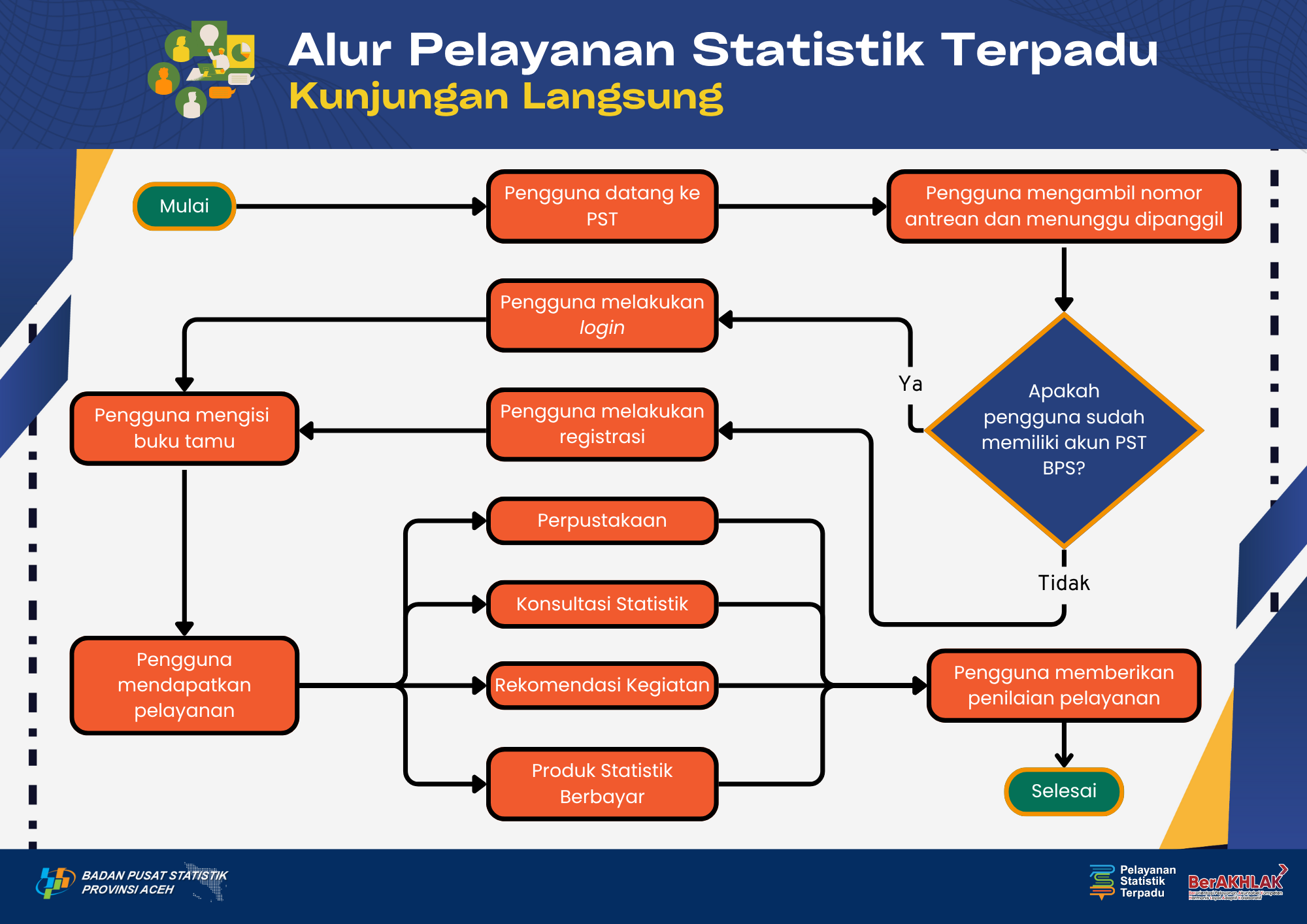 Penyelenggaraan Standar Pelayanan Statistik Terpadu di lingkungan Badan Pusat Statistik Provinsi Aceh merupakan implementasi dari pelaksanaan tugas dan fungsi Badan Pusat Statistik, yang bersifat pelayanan langsung (offline) dan tidak langsung (online), yang meliputi: