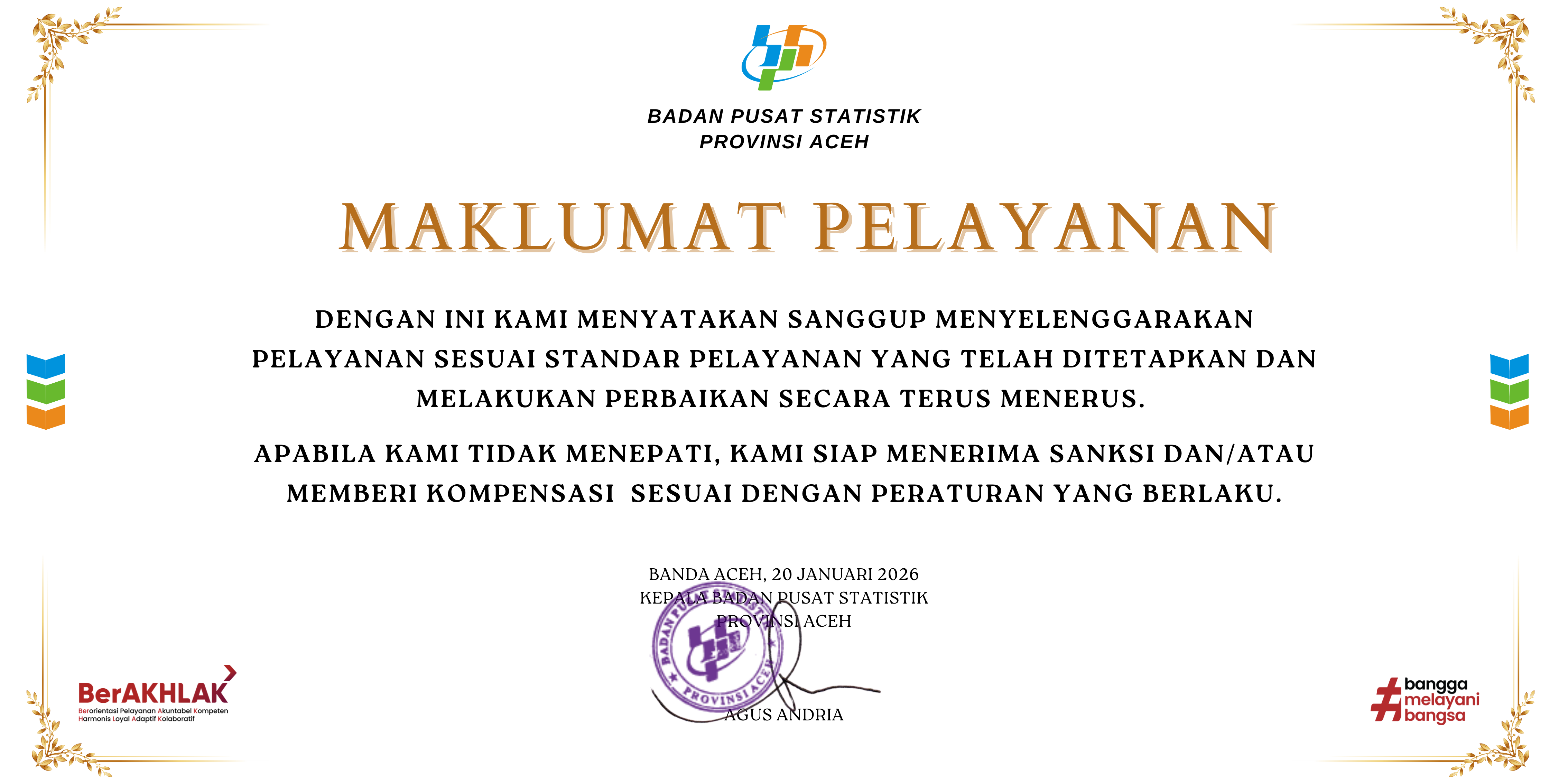 Adapun dalam menetapkan standar pelayanan dan maklumat pelayanan, Kepala BPS Provinsi Aceh telah menetapkan Keputusan Kepala BPS Provinsi Aceh No. 44 tahun 2024 tentang Standar Pelayanan Statistik Terpadu di Lingkungan Badan Pusat Statistik Provinsi Aceh.