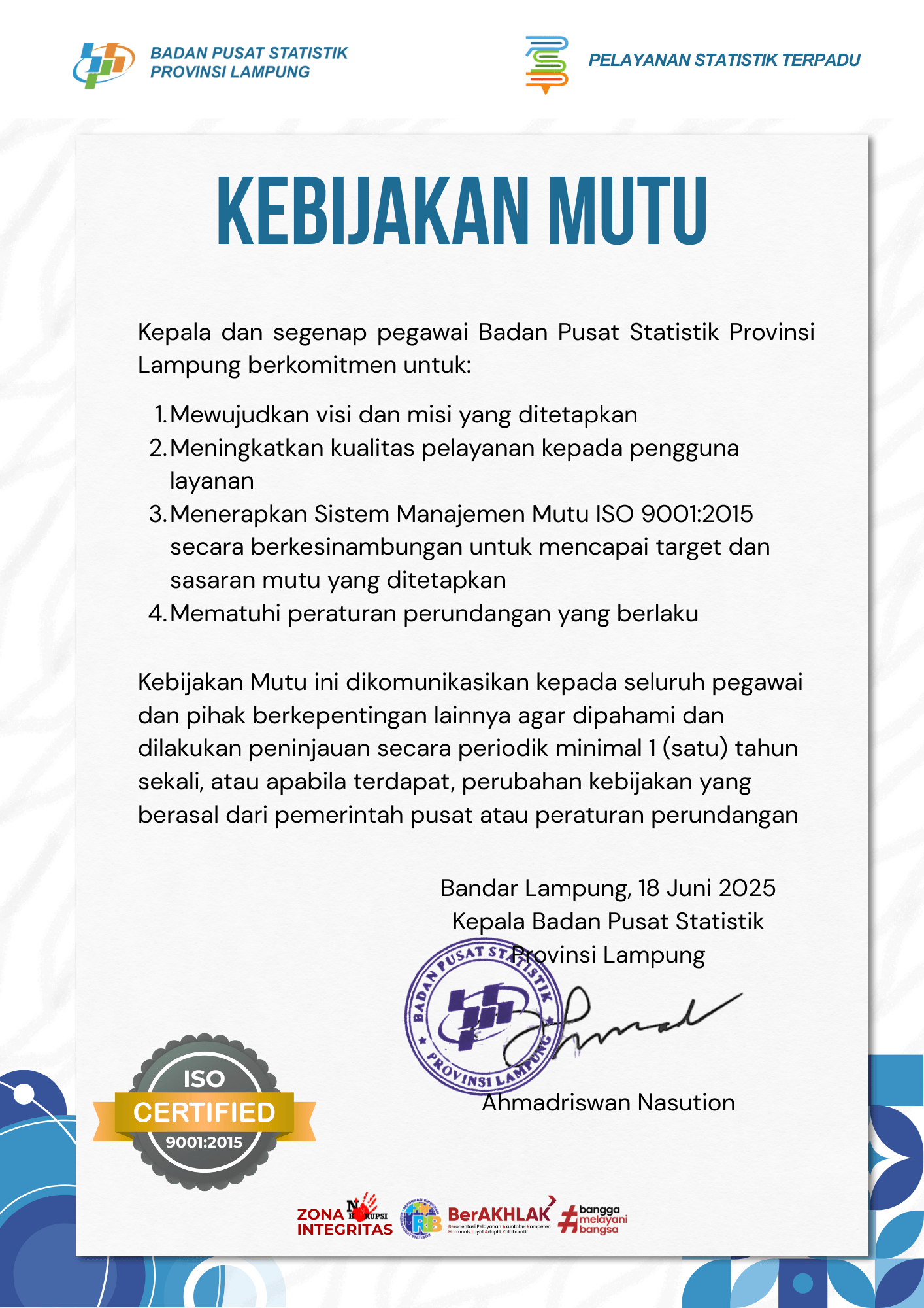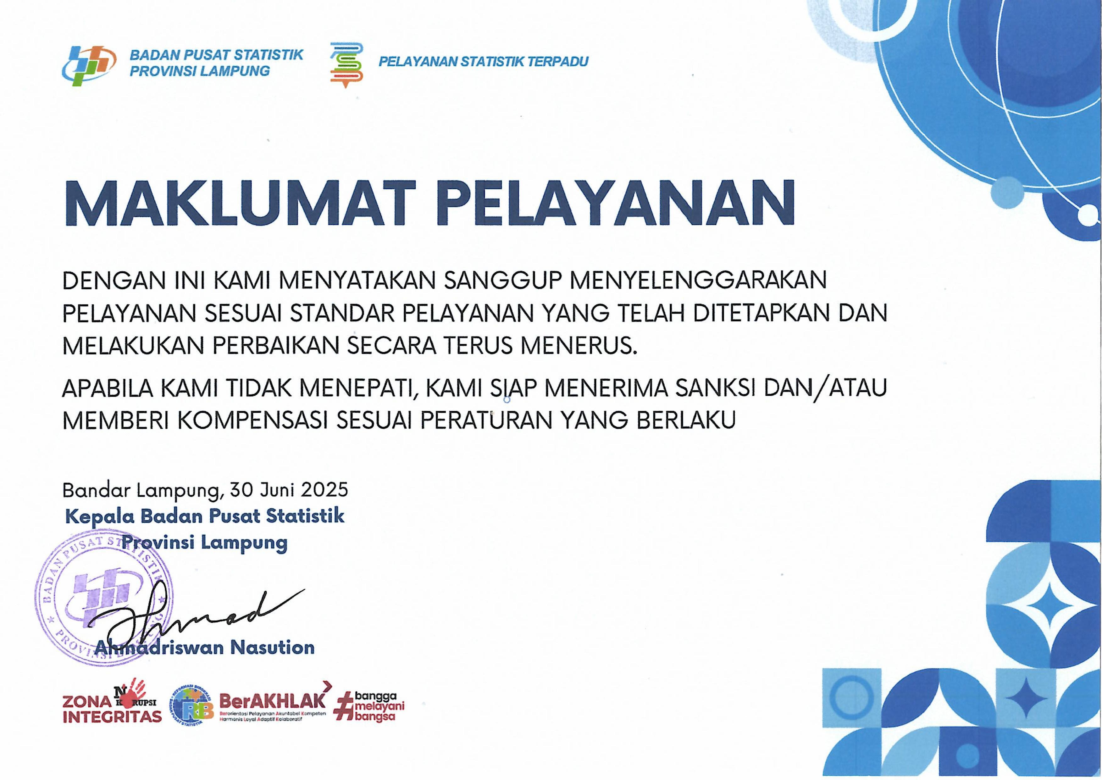 Standar Pelayanan dan Maklumat Pelayanan telah diputuskan oleh Kepala BPS Provinsi Lampung, dan telah ditetapkan melalui Keputusan Kepala sebagai berikut: