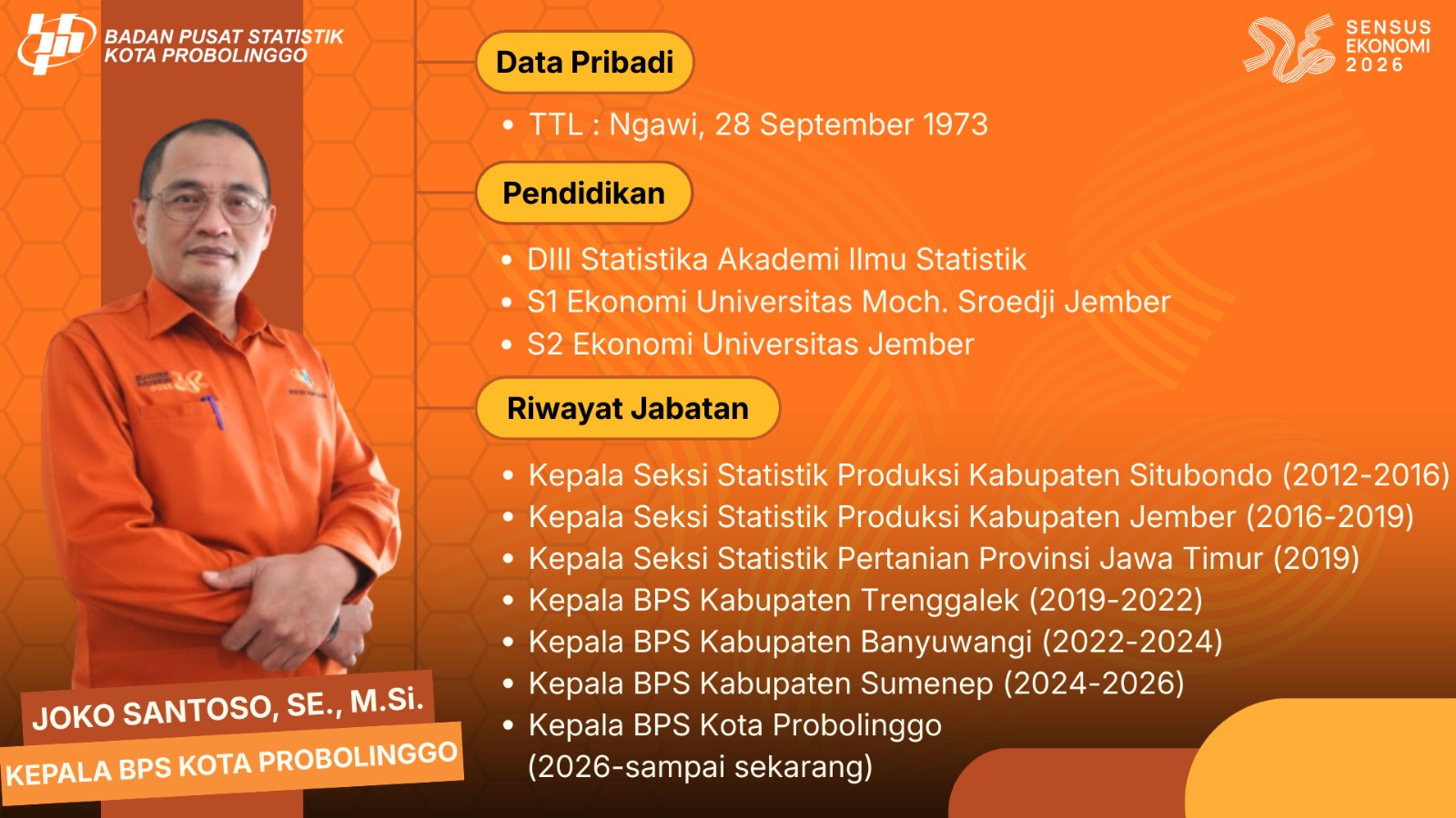 Bertugas memimpin BPS Kota Probolinggo sesuai dengan tugas dan fungsi BPS Kabupaten/Kota serta membina aparatur BPS Kota Probolinggo agar berdaya guna dan berhasil guna.