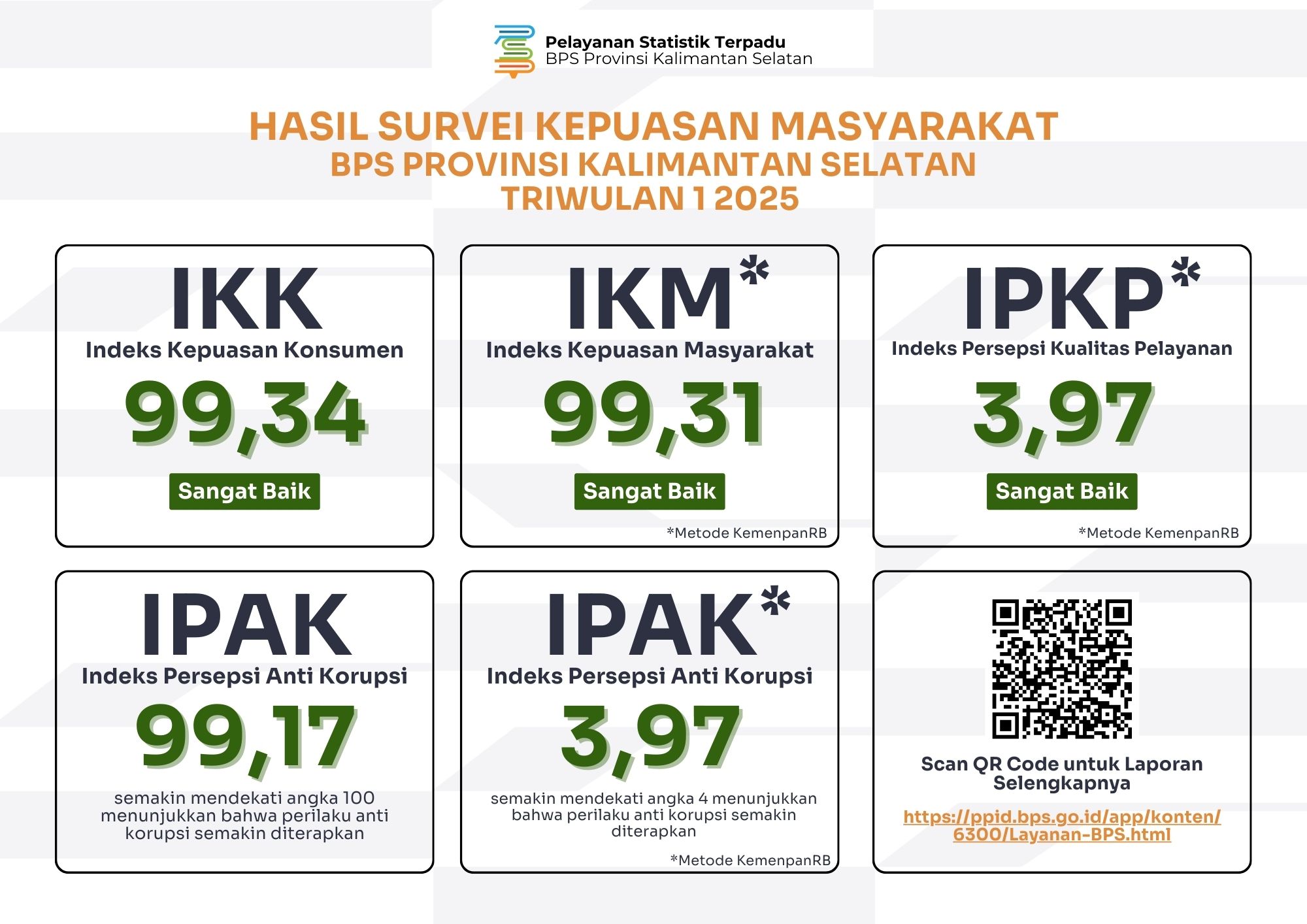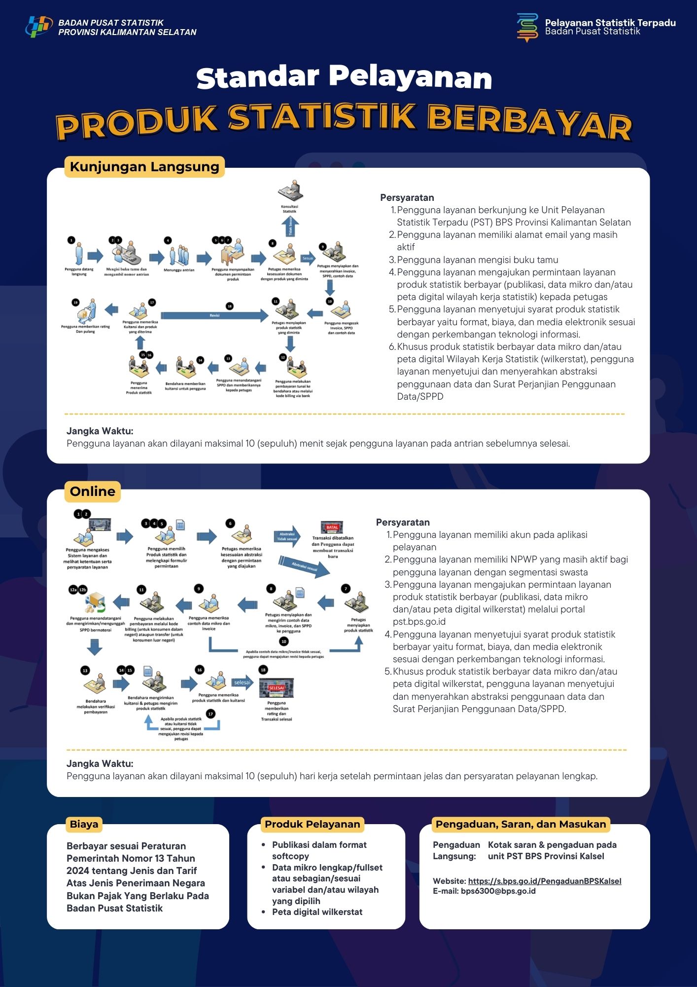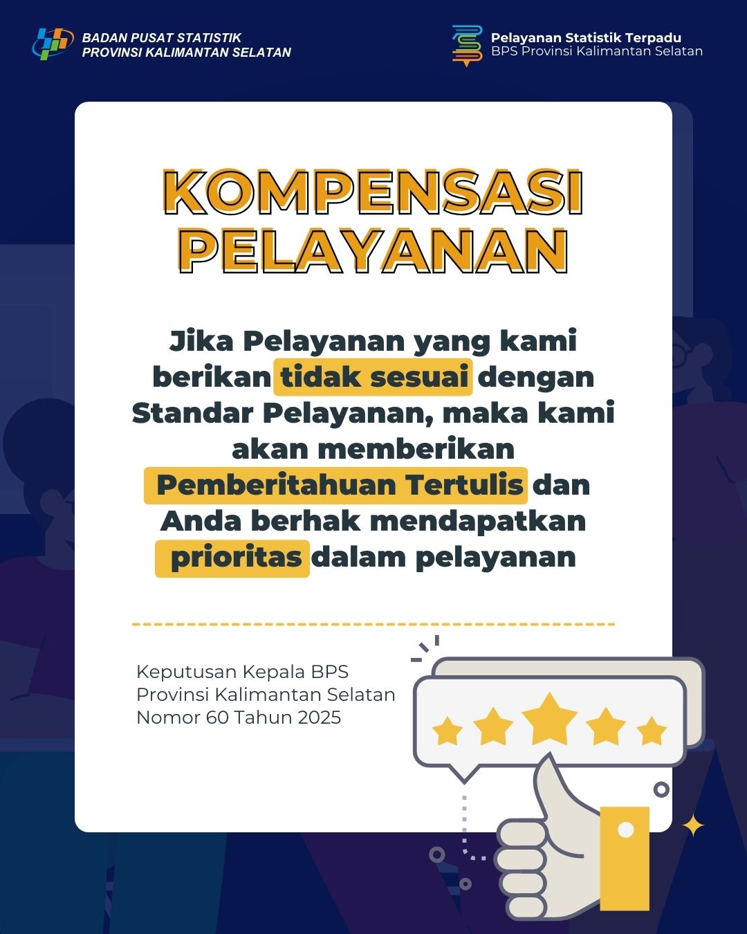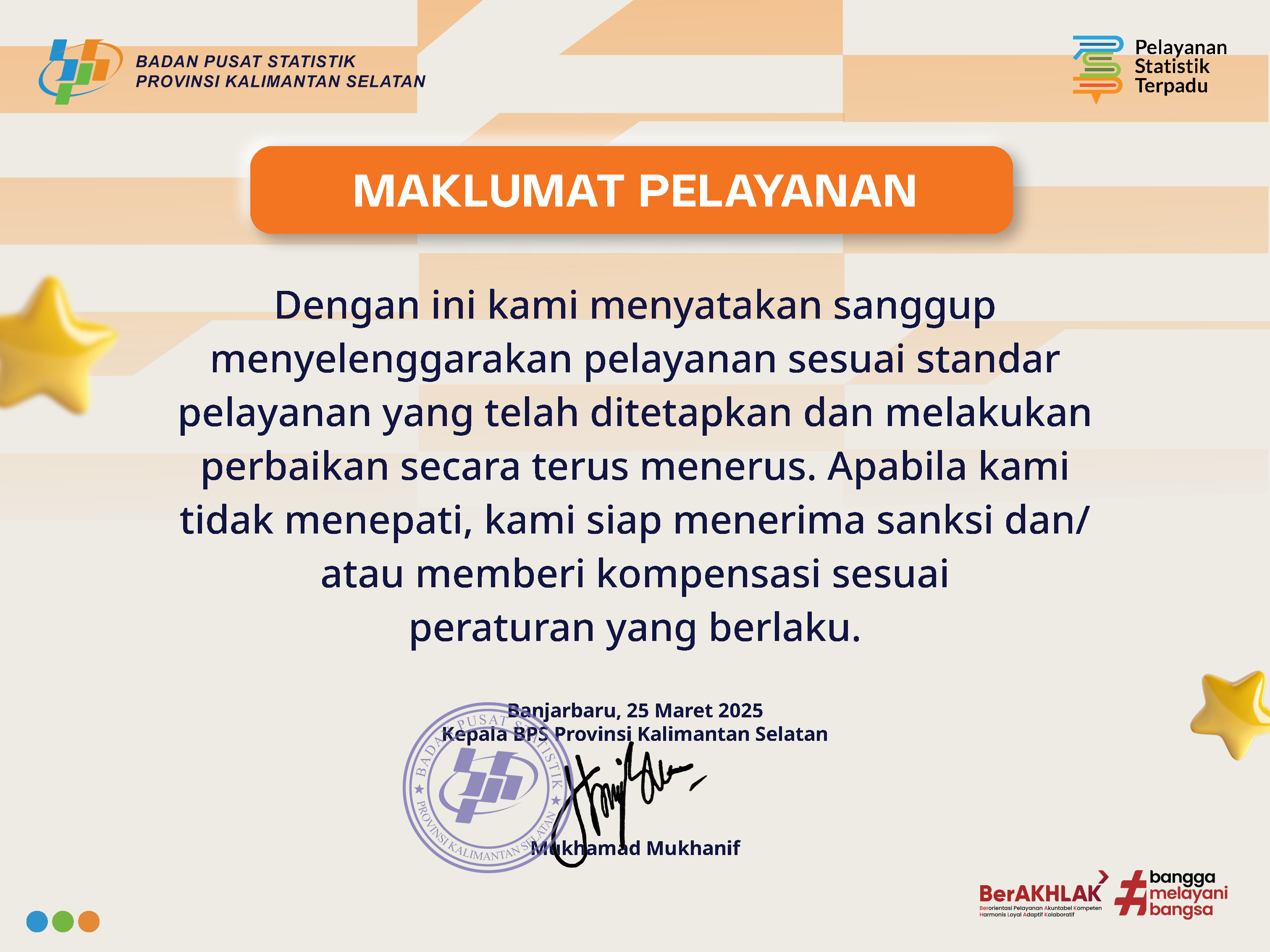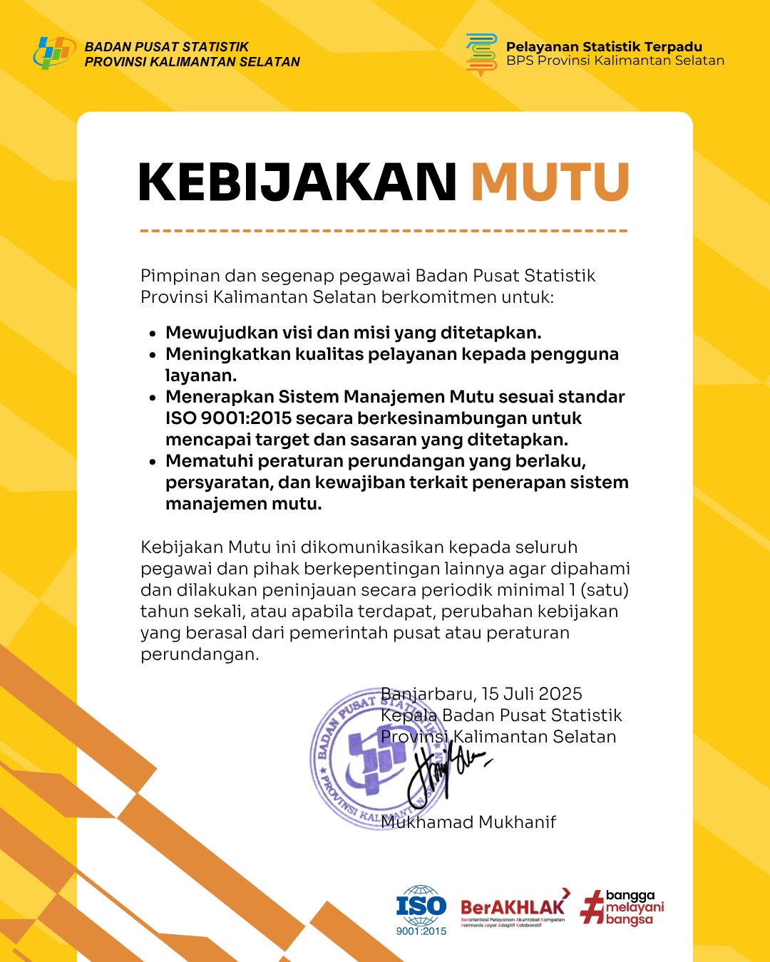 *Setiap permintaan data akan dilayani sesuai dengan Kepka BPS Provinsi Kalsel Nomor 309 Tahun 2024 tentang Standar Pelayanan Statistik Terpadu pada Badan Pusat Statistik Provinsi Kalimantan Selatan.