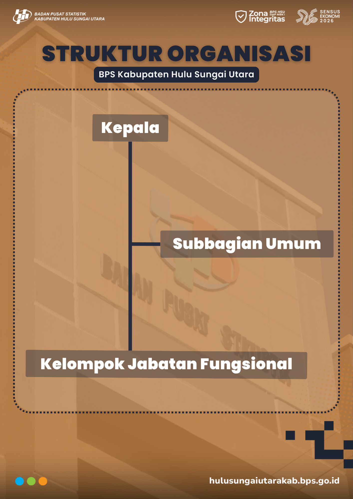 Untuk melaksanakan tugas, fungsi, susunan organisasi dan tata kerja tersebut, sesuai Peraturan BPS Nomor 5 Tahun 2023 tentang Organisasi dan Tata Kerja Badan Pusat Statistik Provinsi dan Badan Pusat Statistik Kabupaten/Kota, telah ditentukan struktur organisasi Badan Pusat Statistik Kabupaten Hulu Sungai Utara, yaitu: