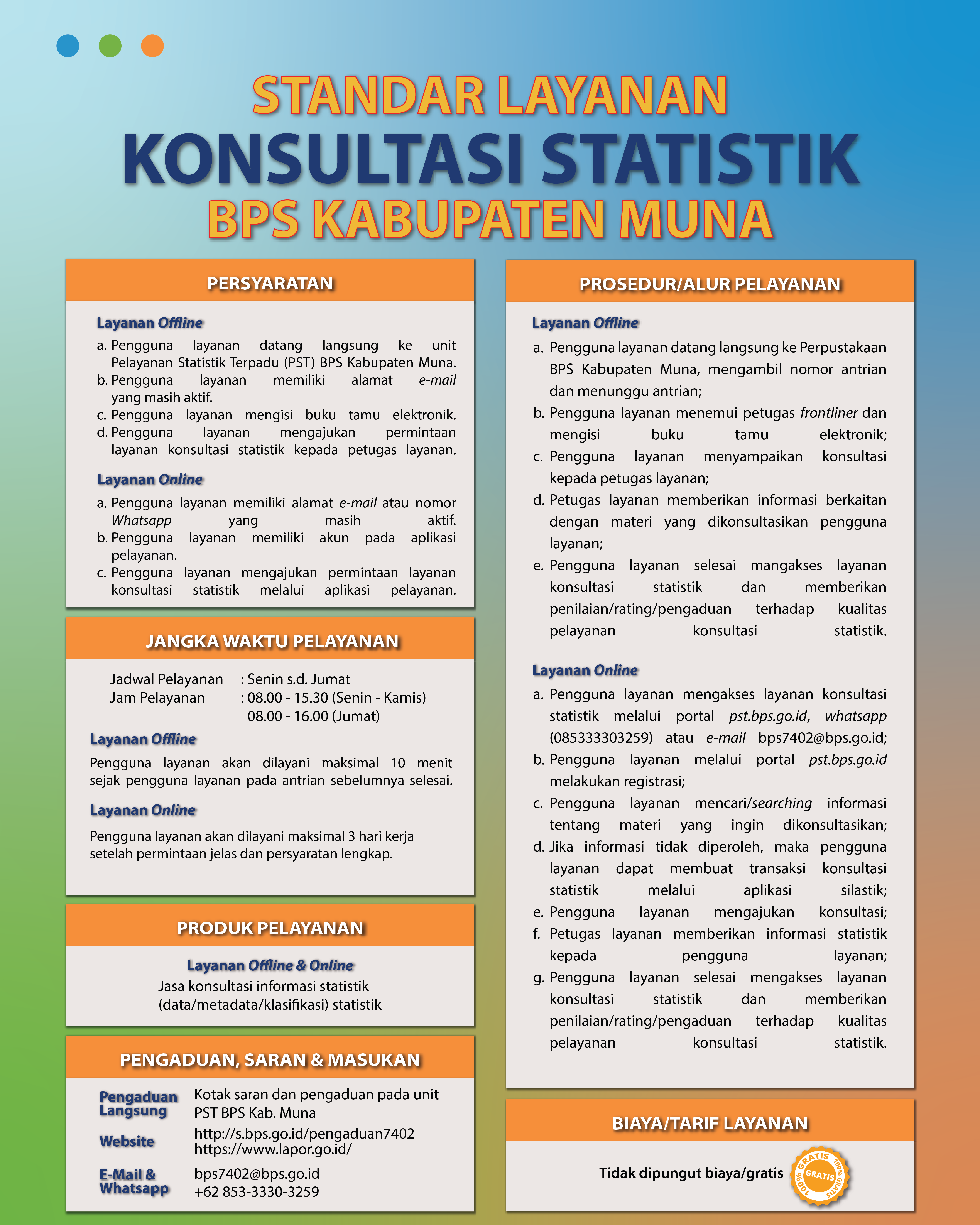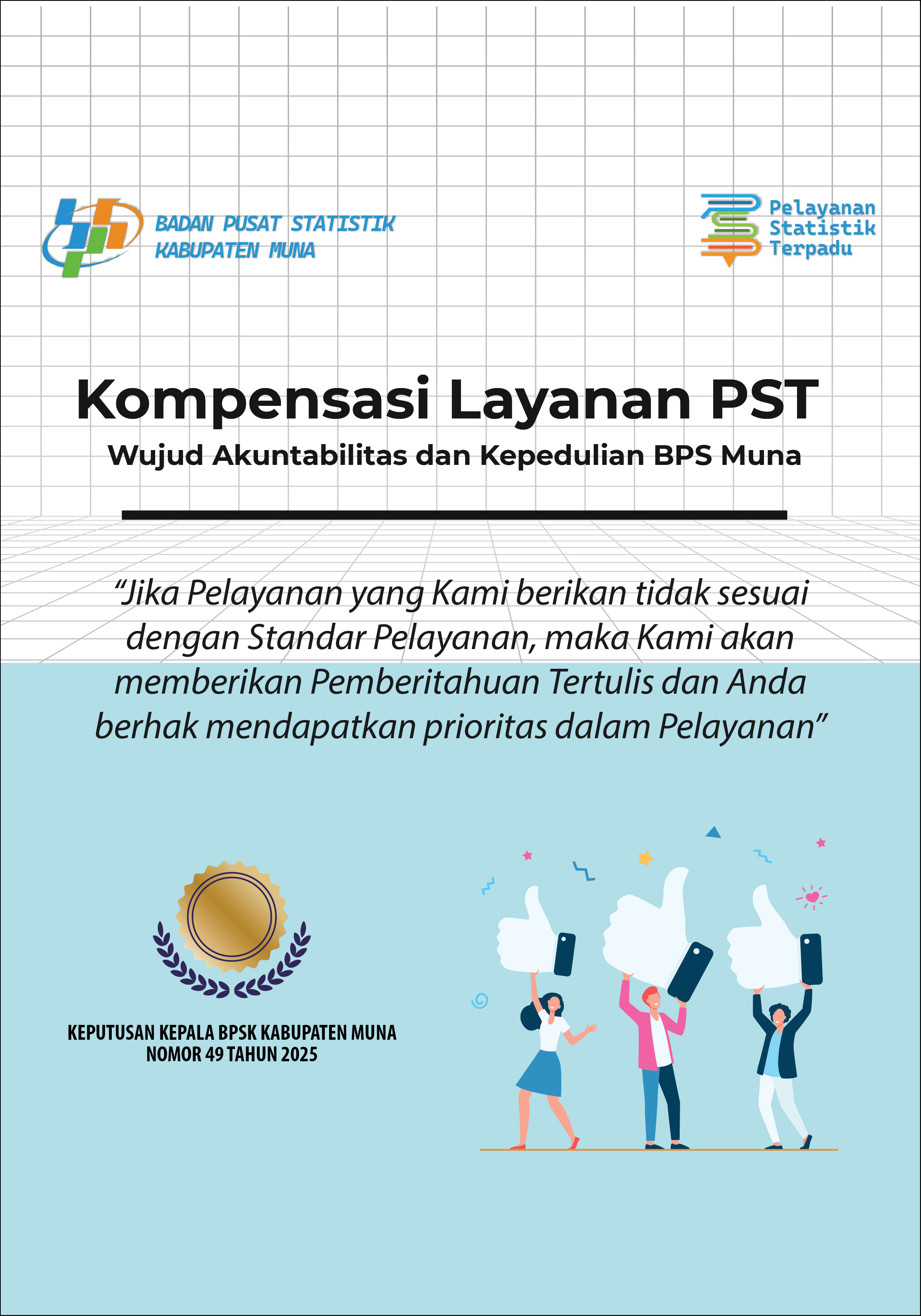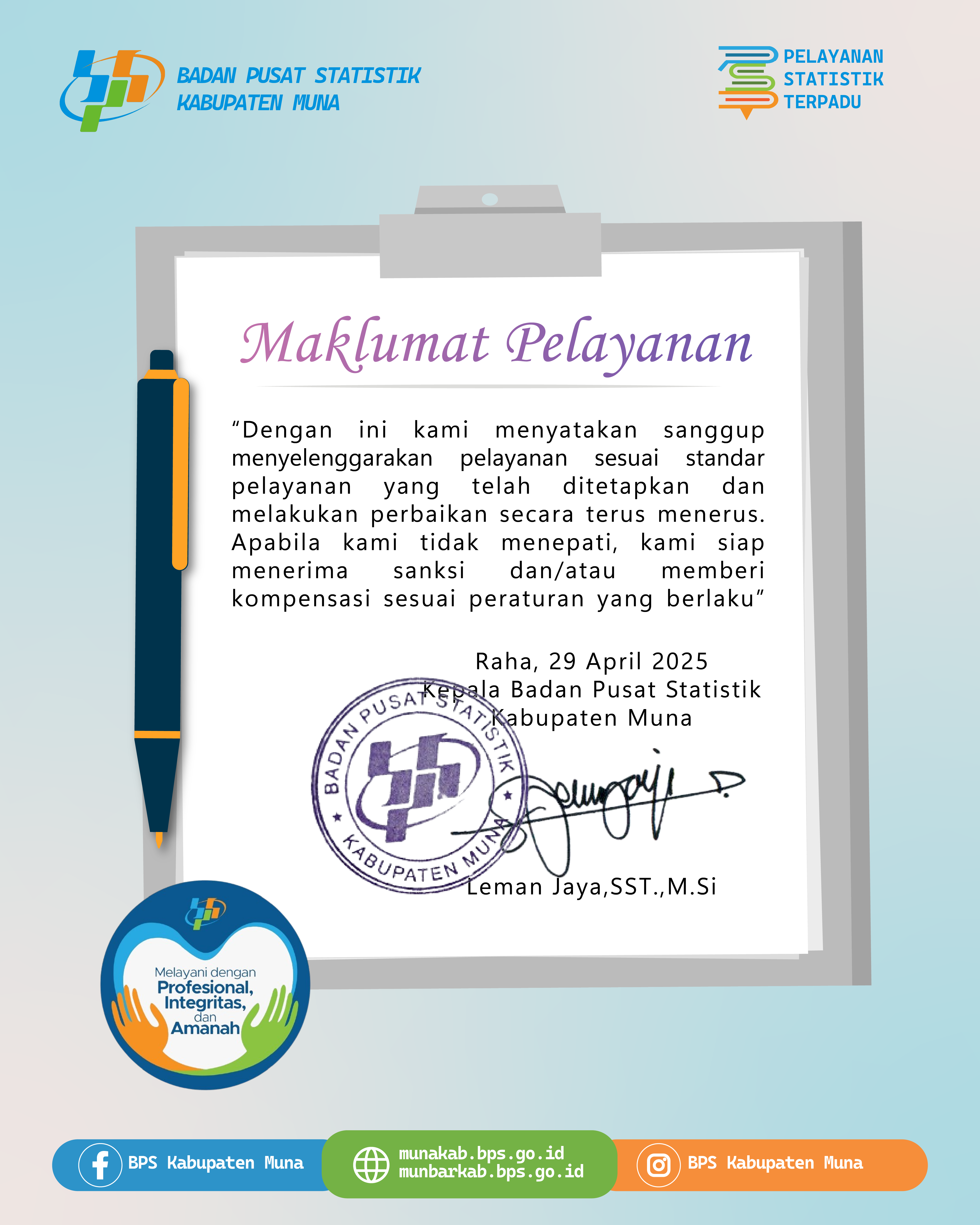 Dalam menetapkan standar pelayanan dan maklumat pelayanan, Kepala BPS Kabupaten Muna telah menetapkan Keputusan Kepala BPS Kabupaten Muna Nomor 10 Tahun 2024 tentang Standar Pelayanan Statistik Terpadu di Lingkungan Badan Pusat Statistik Kabupaten Muna.