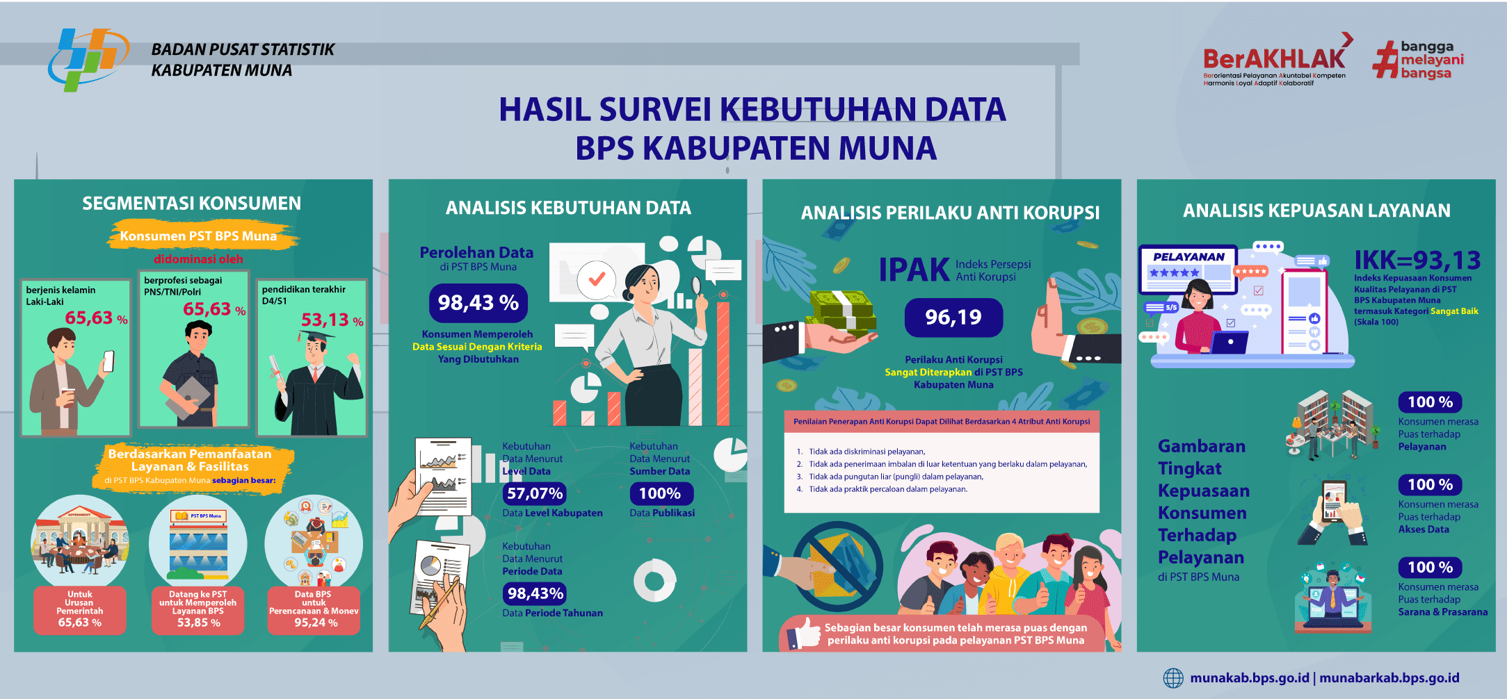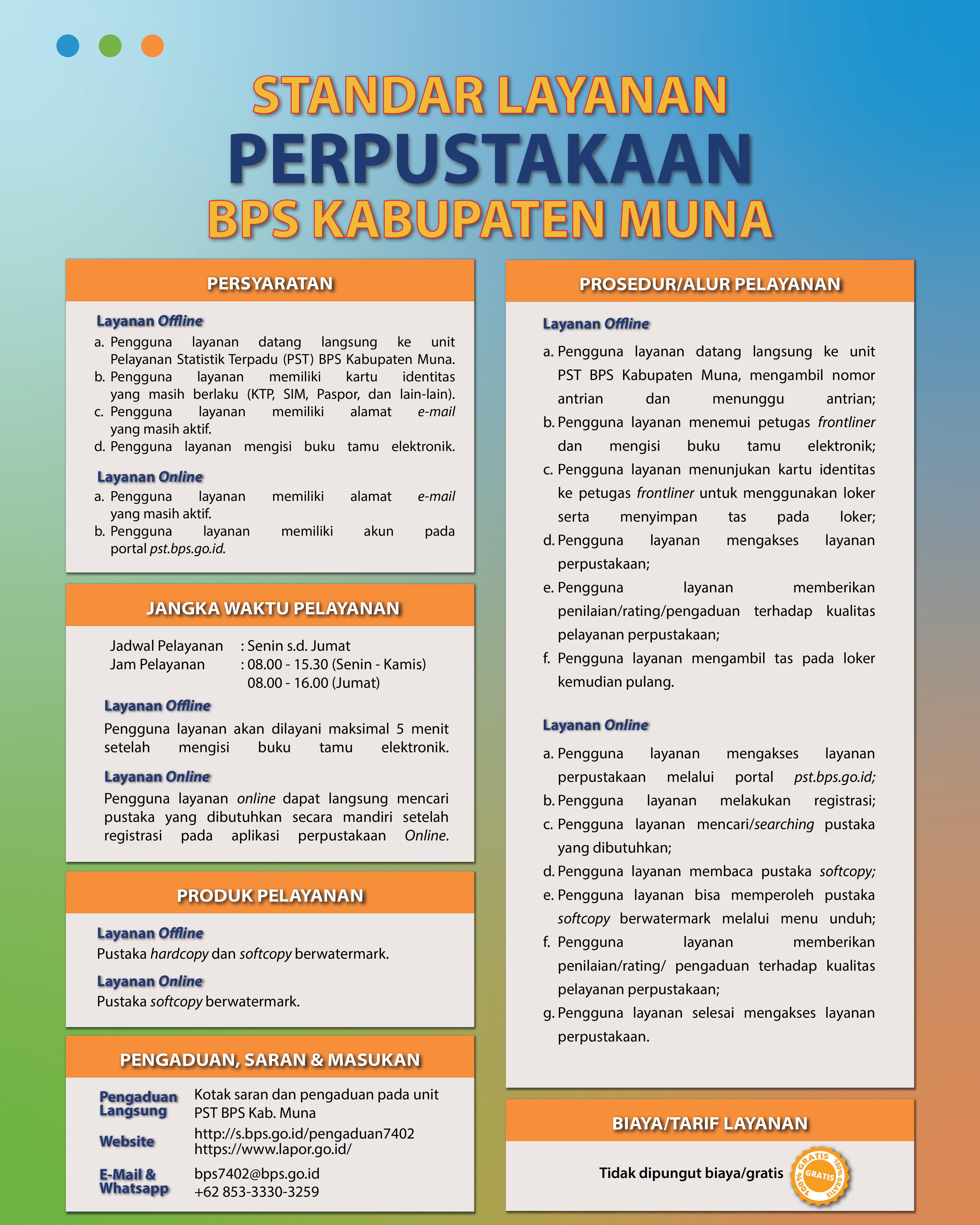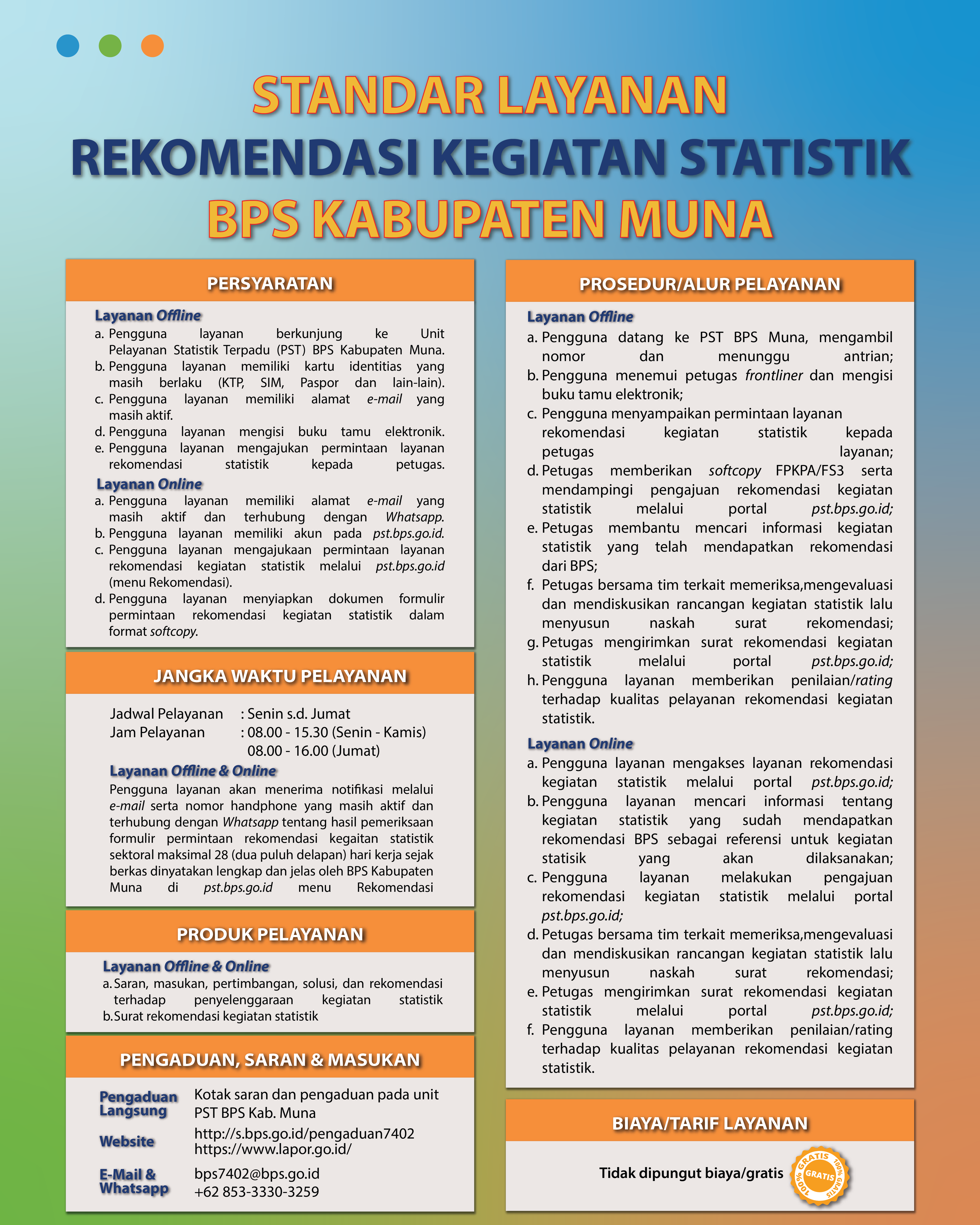 Dalam menetapkan standar pelayanan dan maklumat pelayanan, Kepala BPS Kabupaten Muna telah menetapkan Keputusan Kepala BPS Kabupaten Muna Nomor 10 Tahun 2024 tentang Standar Pelayanan Statistik Terpadu di Lingkungan Badan Pusat Statistik Kabupaten Muna.