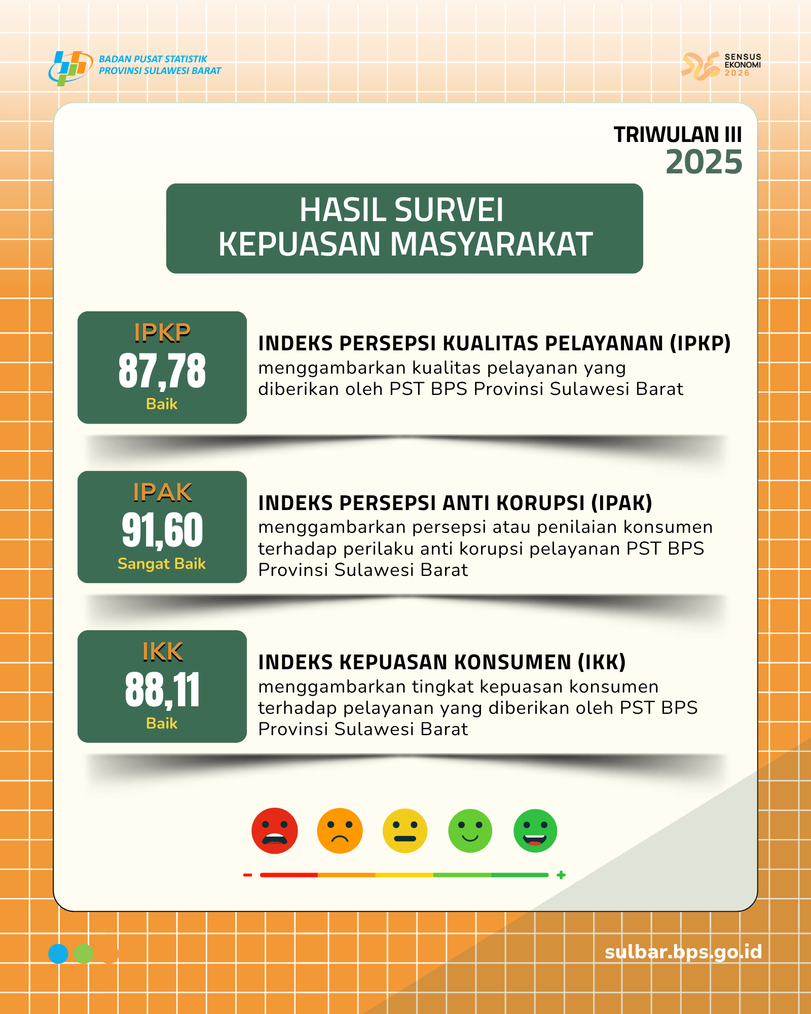 Dalam menetapkan standar pelayanan dan maklumat pelayanan, Kepala BPS Provinsi Sulawesi Barat telah menetapkan Surat Keputusan Kepala BPS Provinsi Sulawesi Barat No. 187/KPG Tahun 2025 tentang Standar Pelayanan Statistik Terpadu di Lingkungan Badan Pusat Statistik Provinsi Sulawesi Barat.